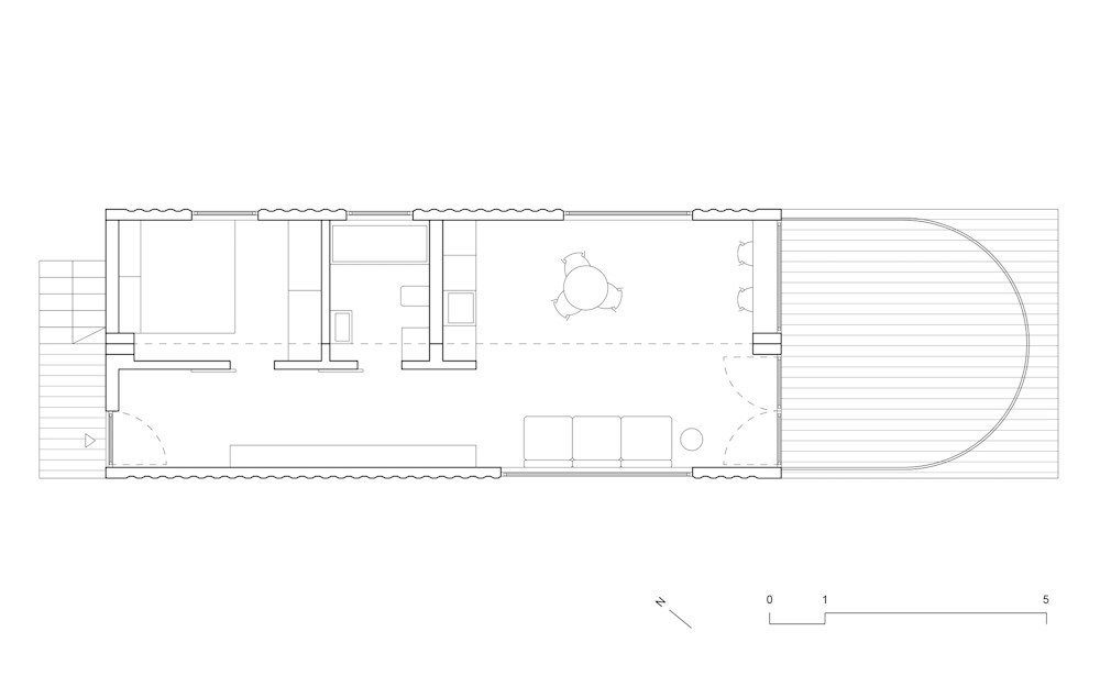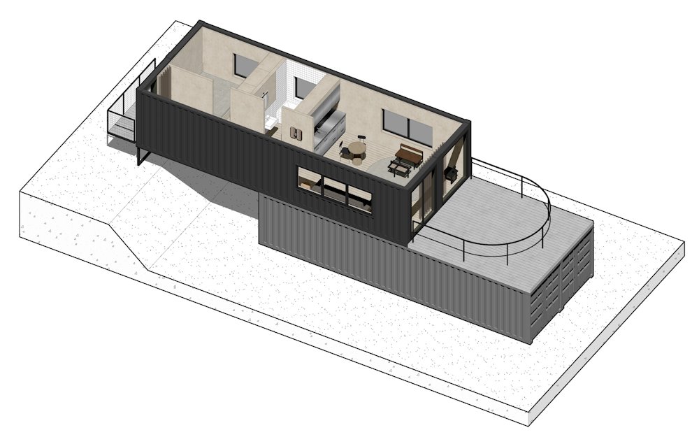 Expansive windows fill the sides of both containers, both in the living area and the bedroom. However, the places where the two containers meet on the interior are completely covered by the floors and ceiling, creating the impression of one monolithic space.