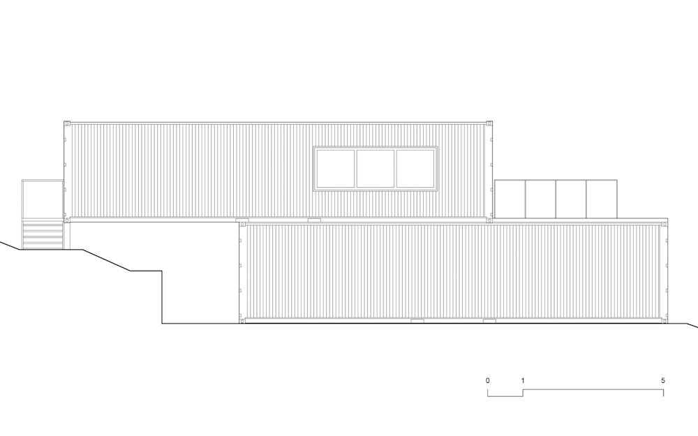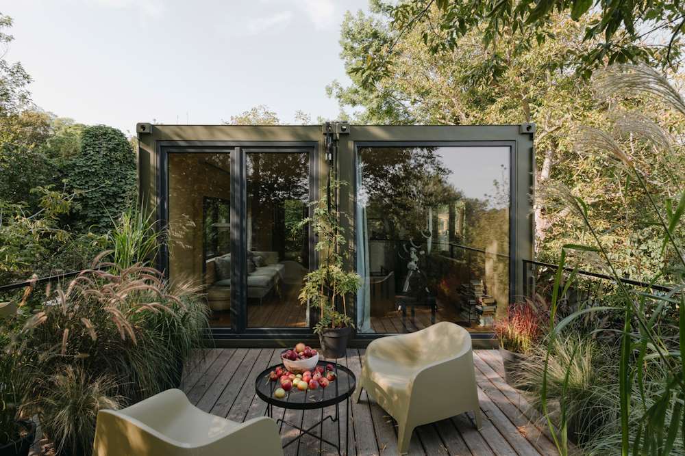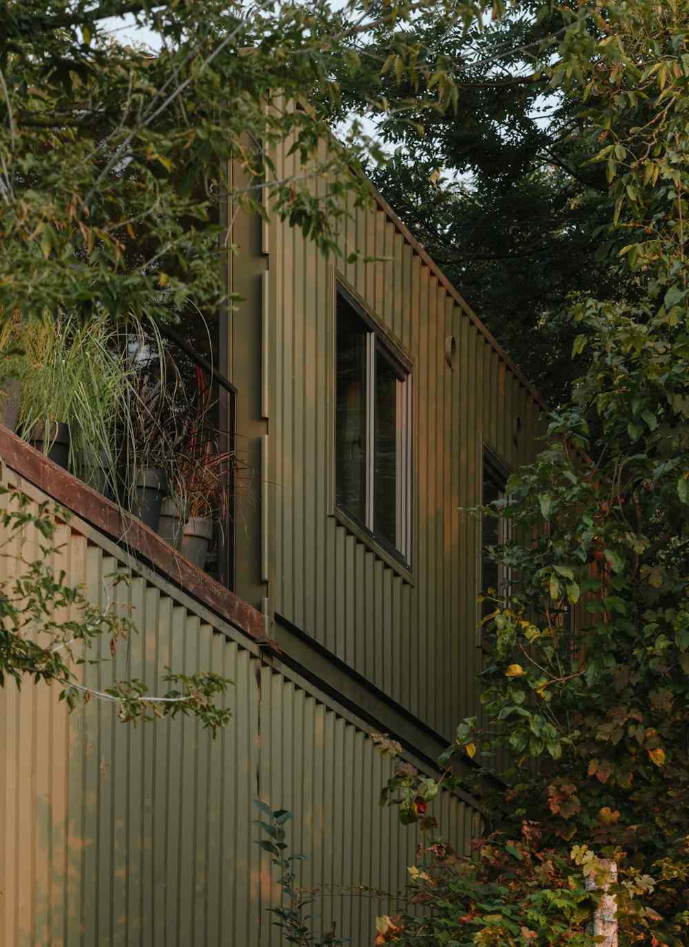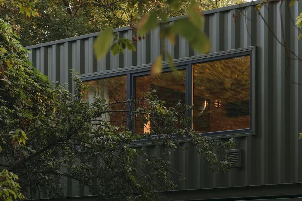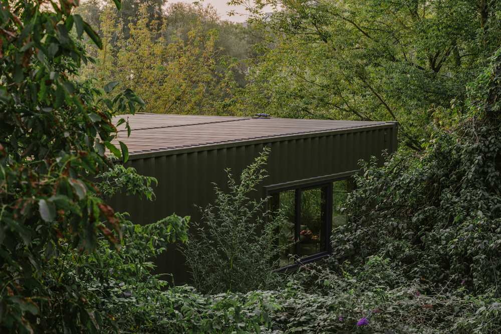 On the outside, the containers’ dull green paint almost camouflages them within the greenery of the garden. Despite the metal construction, the containers seem like they belong there, integrated into the topography and landscaping of the site.