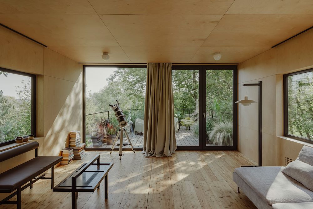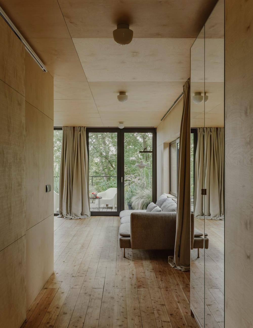 From the patio, you step inside into the living room. Immediately, you’re surrounded by the warm tones of birch plywood that cover the walls and ceiling. As we’ve seen before, the plywood is separated with a slight relief edge in between each piece to give each piece a modern touch.