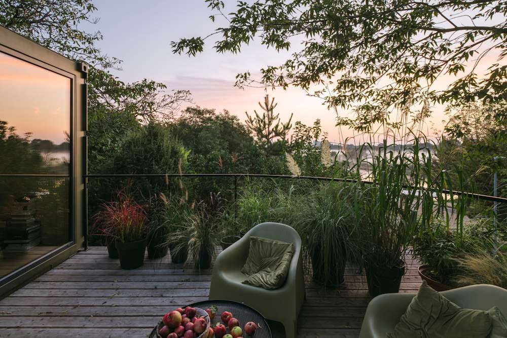 The cabin sits on the property of a community garden near Szelągowski Park, where two 40-foot containers were already used for storage. Vertically stacking two additional containers on top of these garden storage boxes created the cabin, and horizontally offsetting them allowed for the creation of a patio. And since the cabin is slightly elevated, its views of the river from inside and off the patio are that much better!