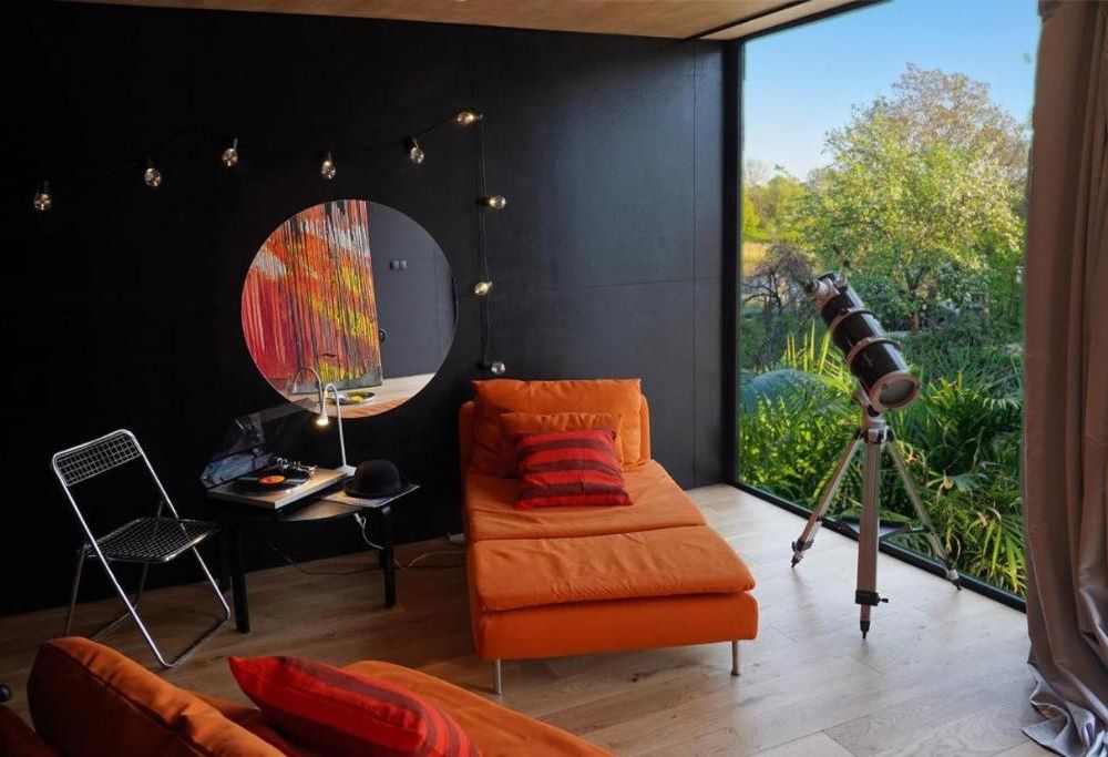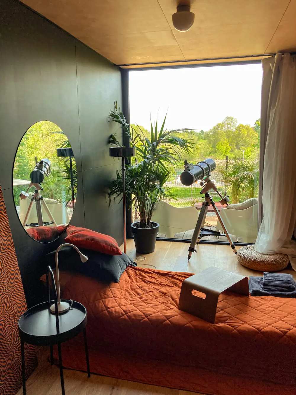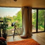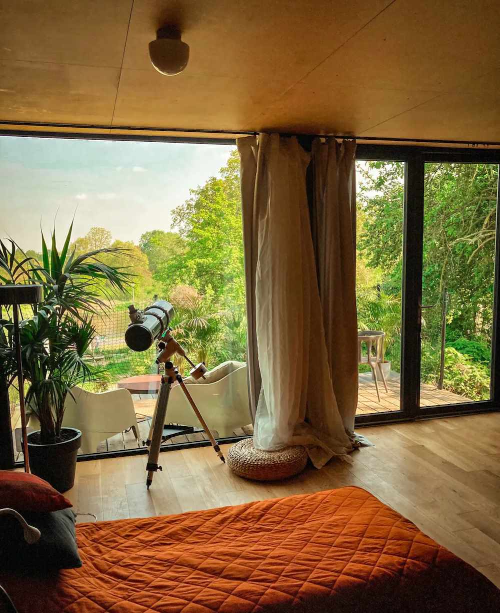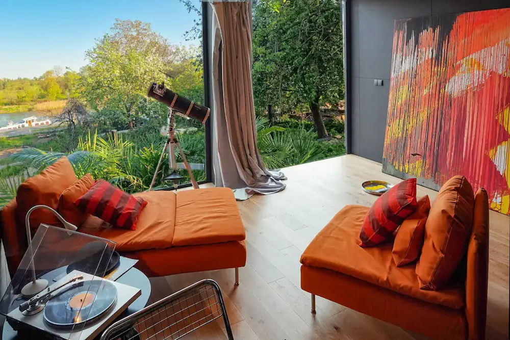 The floor plans are dominated by a large living, dining, and sleeping area. This space is adjacent to the patio in front of each cabin, accessed by huge floor-to-ceiling windows and doors placed at the ends of the containers.