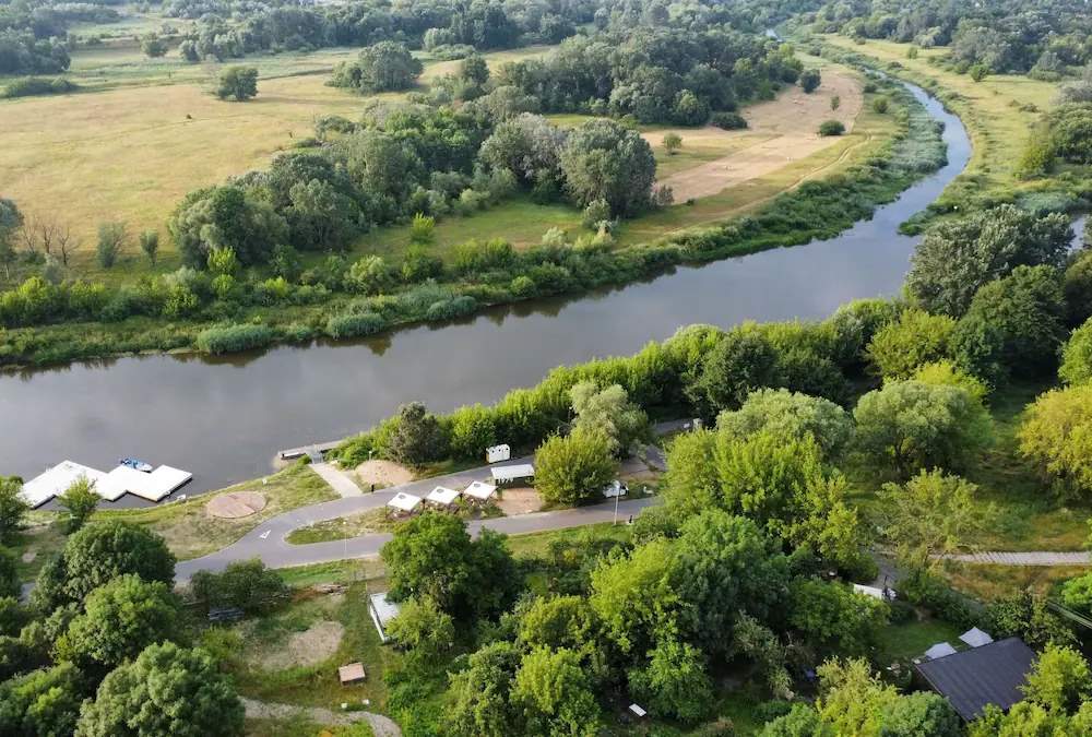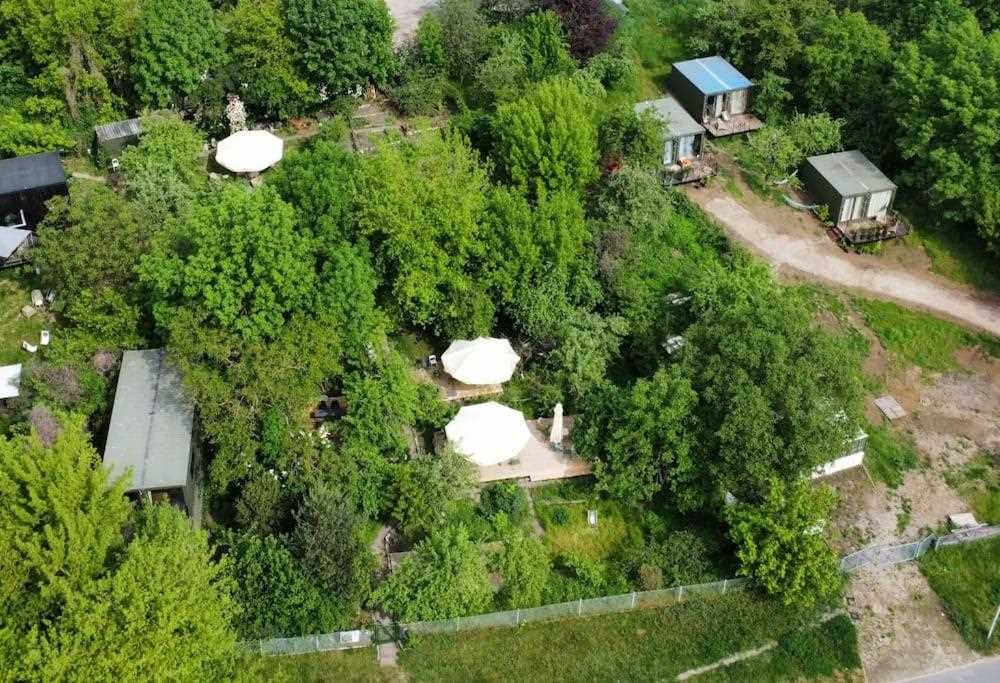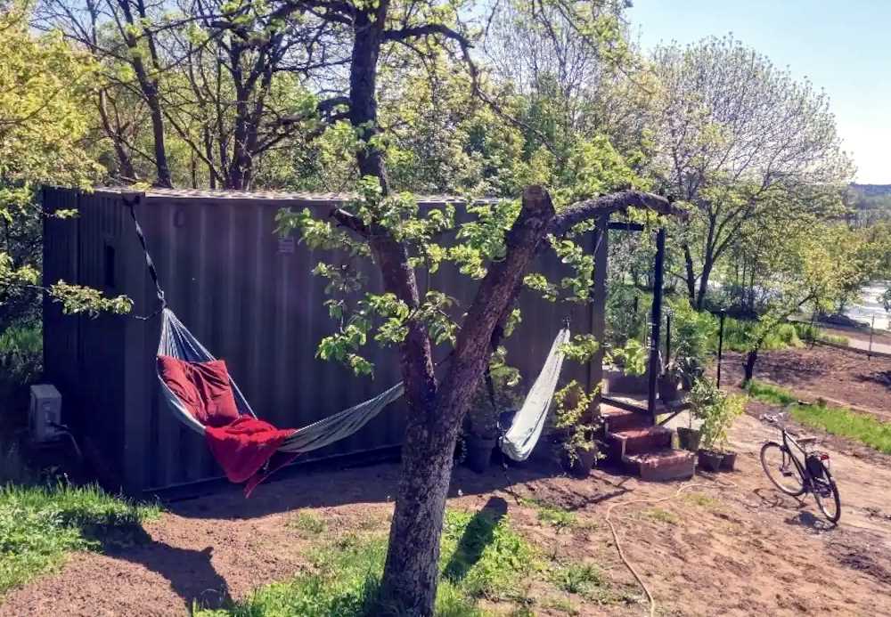 However, just a short stroll away are three cabins built in a similar style to the original Portable Cabin. And in addition to the common architectural aesthetic, they also share the same beautiful building site: a riverfront community garden inside the city.