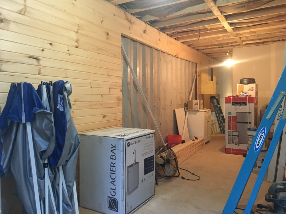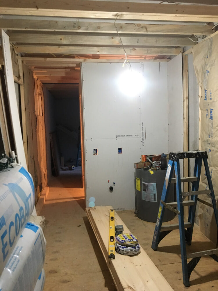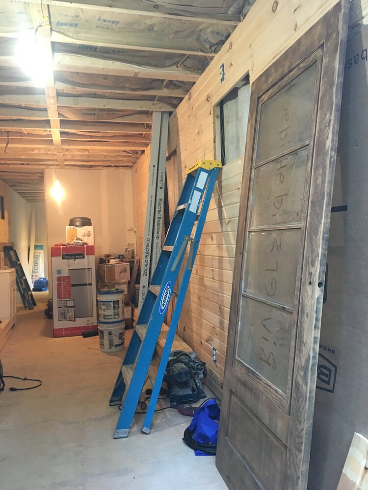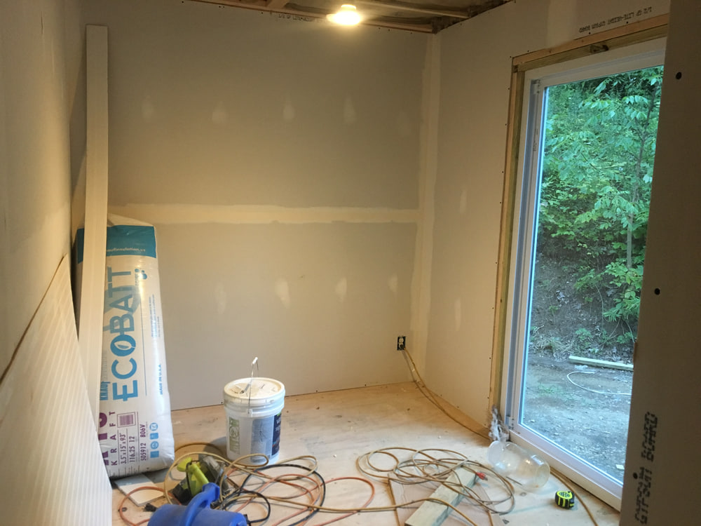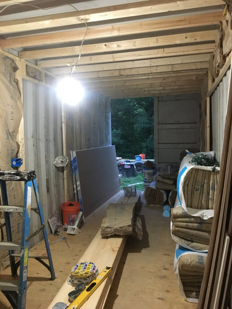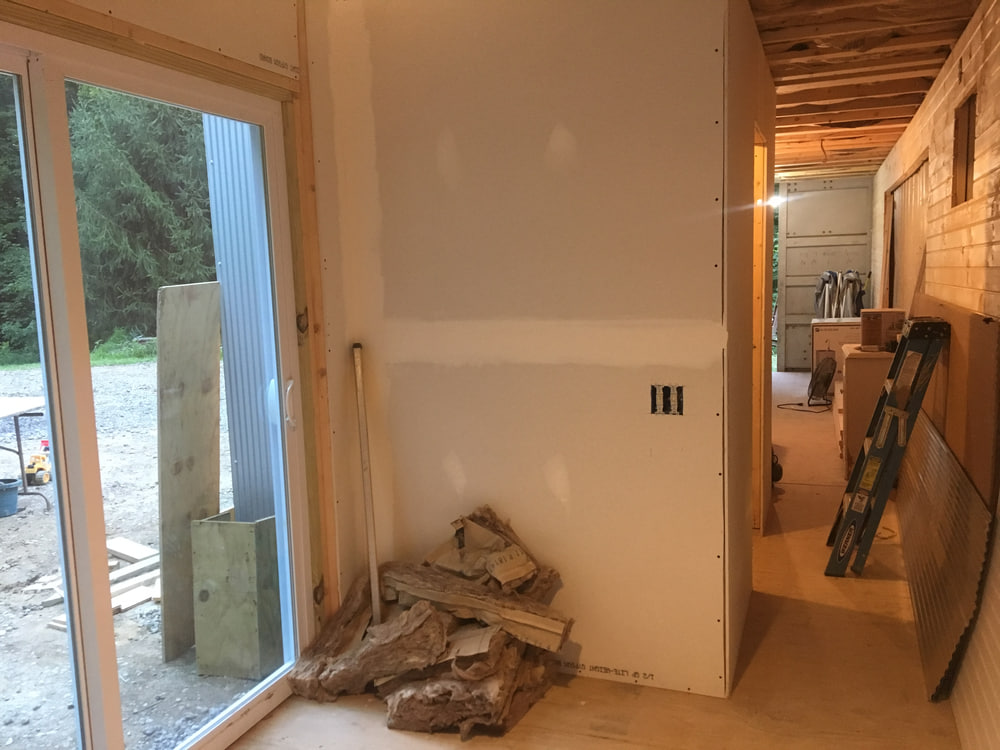 Before making the major container wall penetrations for things like doors, we closed in most of the interior walls with drywall, tongue and groove siding, and corrugated metal in the bathroom.