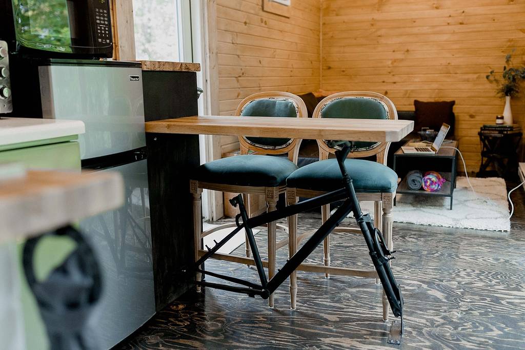 I also really like the two-person bar area we created with a countertop supported by an old bicycle frame.