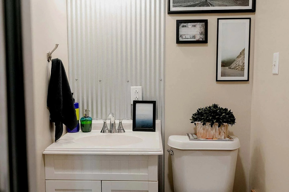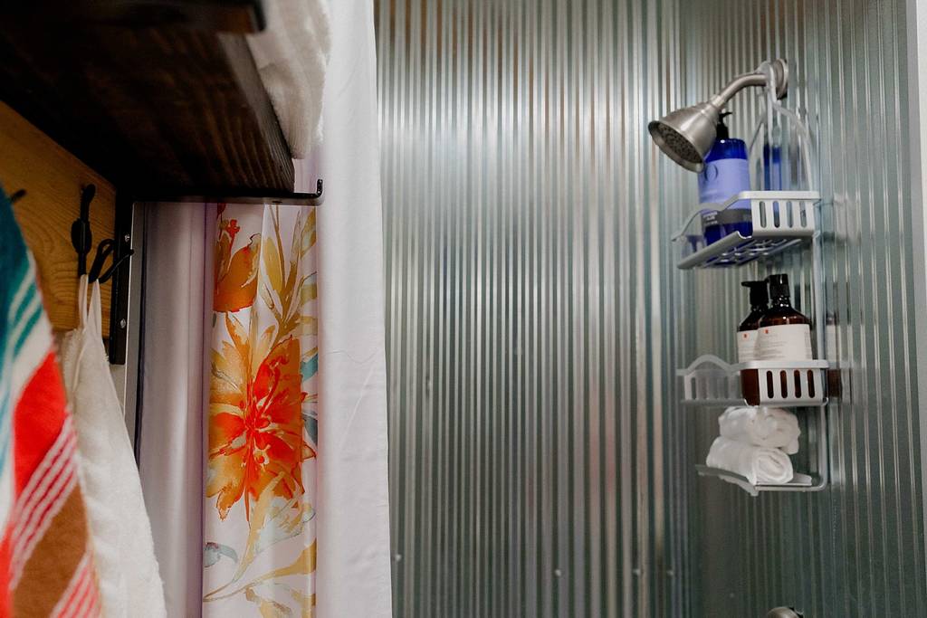 Past the kitchen is the hallway bathroom that has a corrugated metal shower surround and is accessed via a sliding barn door. I laid out the container so that the plumbing was condensed to one area and not against the outside wall to prevent freezing pipes. Therefore, the bathroom and kitchen plumbing both go through a shared interior wall.