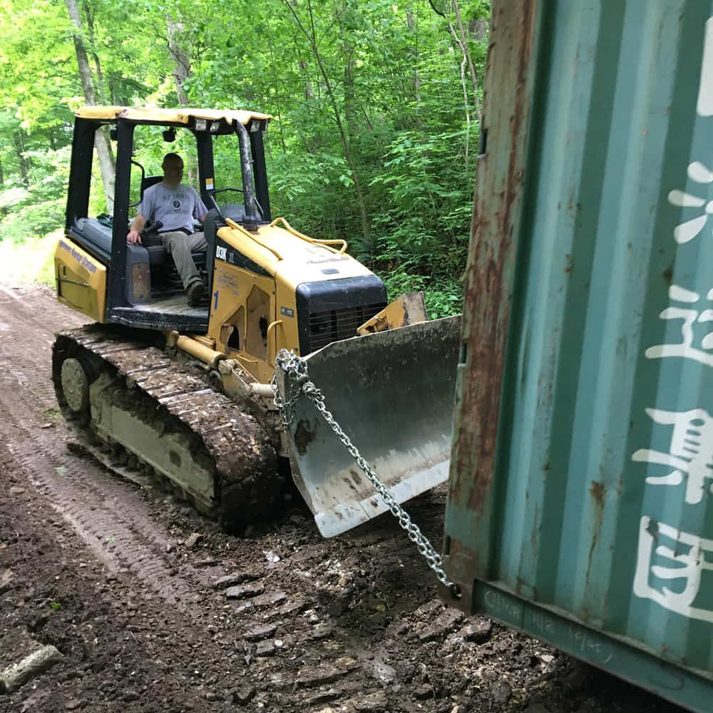 On June 1st, the empty container that I bought from Craigslist arrived.   However, our driveway has an almost 90-degree turn in it, with nowhere for a long truck to turn around.  So, we had the container dropped off on the ground, and used a bulldozer to drag it up the 400ft driveway.  Luckily we thought about this beforehand and built it into our plan by having the bulldozer ready and by not adding gravel until afterward.