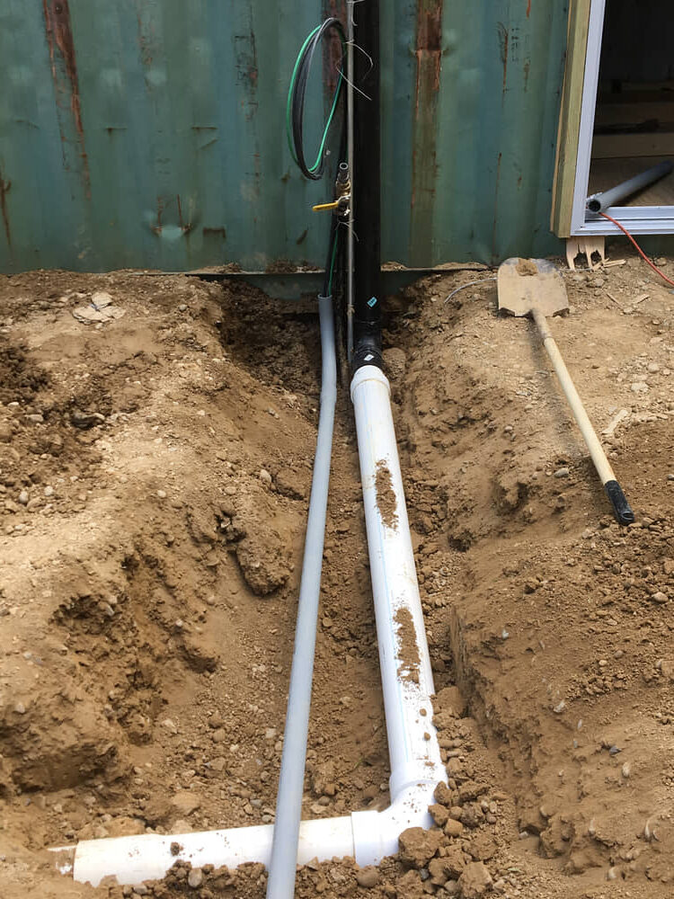Indoor electrical and plumbing were run in the interior wall cavities as is typical.  Outside, we used a chase system to run the electrical and plumbing from an underground trench and into the container at a single point.