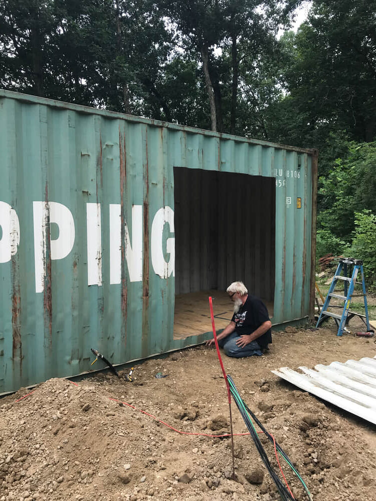I’m lucky to live in a township that doesn’t heavily regulate building projects, so the construction was able to commence quickly. We broke ground on May 22nd, prepping the building site ourselves with some rented equipment.  Our work was made easier by the fact that a mobile home had previously been located at the building site.  After placing our six concrete footers (each approximately five feet deep and two feet in diameter) we were ready for the container.