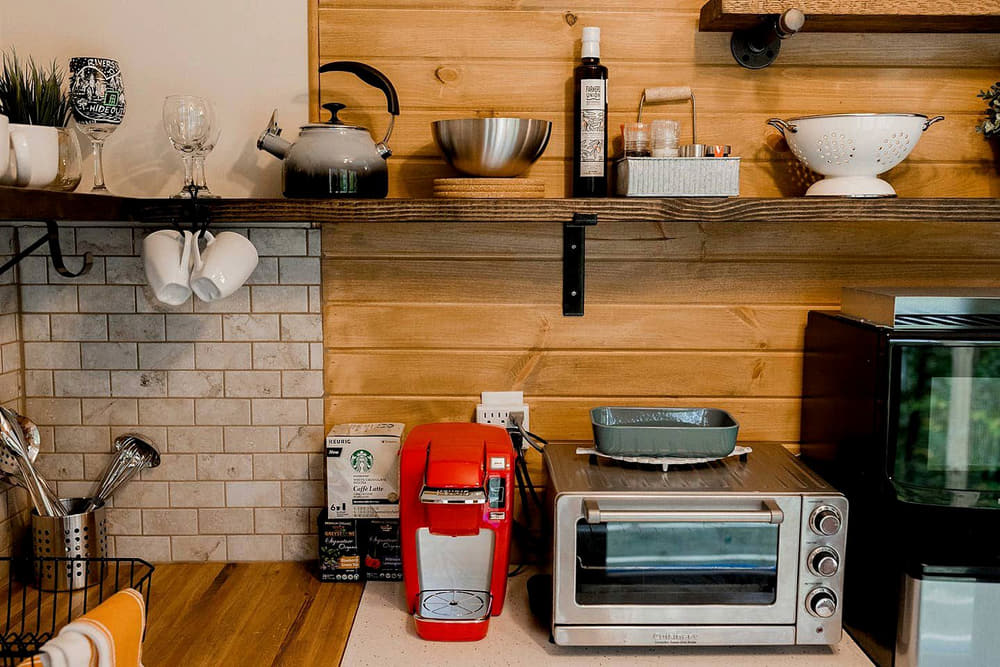 The open kitchen includes 12 feet of open shelving along with a handful of drawers, cabinets, and countertop spaces.  An important feature we incorporated is a locking cabinet that holds cleaning supplies, towels, and sheets.