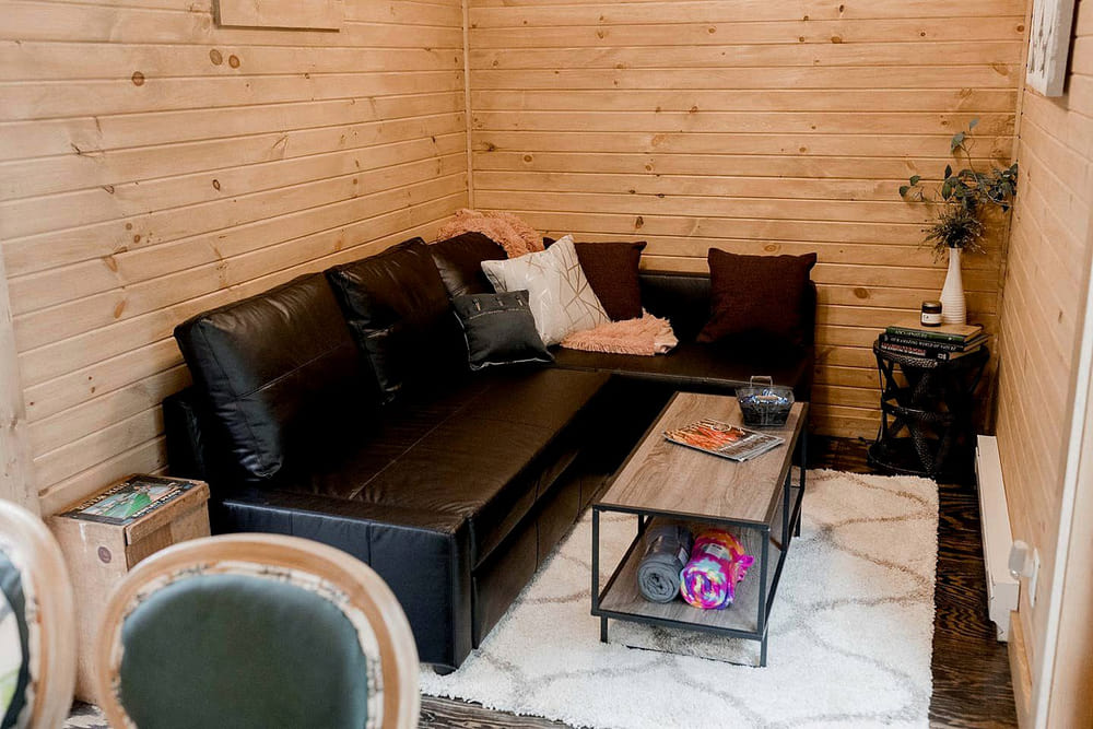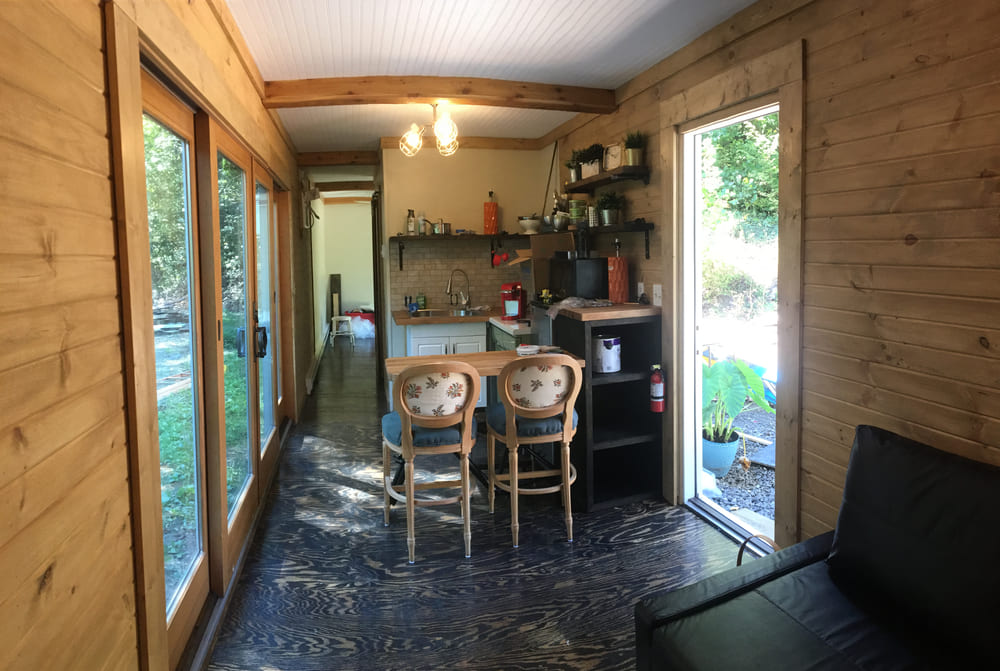One end of the house has a living room with a queen-sized fold-out couch. It’s a cozy place to sit, with great views out the back of the house through the sliding glass doors.