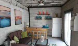 This 20 ft container build has sliding glass doors on the side opening to large covered deck. On nice days, you can open the container’s end doors to reveal a small, covered side deck. Inside is a great space for a home office.